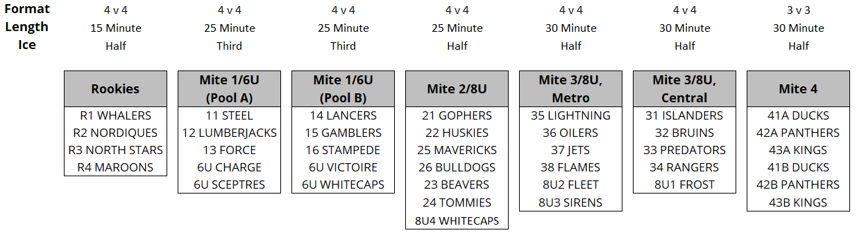 - Rookies, Mite 1, Mite 2, Mite 3, 6U and 8U will have :90 second shifts